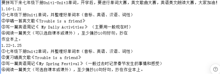 第一阶段 1月16日-1月25日 | 1.16-1.17:背诵《竹里馆》《春夜洛城闻笛》并默一;完成《骆驼祥子》思维导图一篇(A4纸,图文并茂,形式新颖)。 1.18-1.19:背诵《逢入京使》《晚春》并默一;完成《骆驼祥子》手抄报一篇(8K白纸,图文并茂,形式新颖) 1.20-1.21:背诵《登幽州台歌》《望岳》《登飞来峰》并默一; 1.22-1.23:背诵《游山西村》并默一;完成《骆驼祥子》阅读笔记一篇(准备一个康奈尔笔记本:采用康奈尔笔记形式,不同颜色笔旁批,后面加上阅读感悟,后面阅读笔记要求同样) 1.24-1.25:背诵《己亥杂诗》默一,完成《骆驼祥子》阅读笔记一篇。 | 1.16订正考试卷子并整理错题6个;1.17-1.19课本11页习题,课本28页随堂,29页习题,36页,6.7.11.16.17.18 1.20-1.22课本48页习题,课本54页习题,课本68页习题,课本78页习题 1.23-1.25课本80页随堂+习题,课本82页4.5.6.11.12. 两份卷