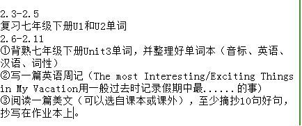 第二阶段 2月6日-2月11日 | 2.6-2.7:完成《海底两万里》阅读笔记一篇; 2.8-2.9:完成《海底两万里》读书笔记一篇; 2.10-2.11:完成《海里两万里》读书笔记一篇 | 2.6-2.8课本92页习题,课本94页习题,课本97页习题,课本108页1.2.3.4 ,课本139页1.2.3.4. 2.9-2.11课本154页习题,课本158/习题,课本160页习题,课本164页习题,课本168页习题, 1份卷 |