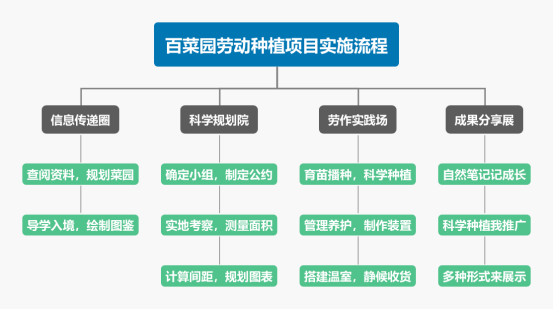 西苑学校劳动教育项目化设计 一、项目概述 劳动课程是一门培养学生劳动观念、劳动能力、劳动习惯与品质、劳动精神的综合性学科。《劳动课程标准》要求:能观察植物的生长发育情况,知道常见植物的养护;遵循植物生长规律和季节特点进行科学劳动;感受持续性劳动的艰辛和不易,懂得珍惜劳动成果,养成持之以恒的劳动品质。劳动种植能引导学生树立正确的劳动价值观,崇尚劳动、尊重劳动,增强对劳动人民的感情。 城市里的孩子远离自然与土地,由于缺乏实践,孩子们对于种植知识了解很少,这方面的知识和体认缺失。为此,学校开辟出一处“校园种植区”,号召各班开展种植养护活动,引导孩子在劳动实践中锻炼能力、体验生命。六年级开发了“爱在西苑”百菜园劳动种植项目化实践活动,旨在通过对菜园种植规划、栽种养护、收获分享等实践活动,获得多方面的体验和感悟,达到五育并举、全面育人。 二、项目目标 劳动观念:通过对学校百菜园的规划、种植、管理等实践体验,体会劳动的辛苦,生发劳动热情和对劳动者的敬重。 劳动思维:科教融合,将科学的知识、方法和能力融合到劳动实践中,运用于“小菜园,大学问”项目化学习的探索和实践中,不断进行论证,有效培养学生的劳动思维。 劳动能力:在“爱在西苑”百菜园项目化学习的实践体验中,认识和学会使用劳动工具种植小苗,浇灌小苗,茁壮成长。 劳动习惯与品质:在种植的实践体验中,能够规范劳动、安全劳动,友好合作,科学种植与培育,淬炼劳动习惯和品质。 三、项目准备 (一)调查问卷,了解学生劳动情况 城市里的孩子远离自然,对于种植知识了解很少,动手能力较差。孩子从不参加或偶尔参加农业劳动,即便经常参加的孩子也是去农家乐之类的进行一些瓜果的采摘活动。通过问卷调查,了解孩子们现有的劳动能力及劳动知识,为后期项目的开展提供依据。 随着城市化的进程,学生缺少劳动的机会,劳动的场地,劳动教育的实践性不强,尽管老师会在课堂上为学生提供实践机会,但多为模拟实践,并未和真实的劳动环境、劳动场景结合起来。如何利用好校园内的种植区让孩子们动手进行种植,直观地感受植物生长的过程,发挥校园种植区的教育作用,已然是素养时代的棘手问题。 (二)理论学习,创设信息传送圈 从劳动教育政策变迁中寻找其外在变化,从农耕种植中寻找其内在变化,明确“爱在西苑”百菜园项目化的路径。聚焦核心目标,解决种植中遇到的各种问题,让学生在解决问题的过程中习得能力。因此将驱动性问题拆解成具体的子问题,围绕子问题确定具体的目标,从上而下形成目标链,推进农耕劳作。 四、项目实施 针对六年级同学的兴趣和能力特点,围绕项目目标和素养要求,设计如下项目实施流程。