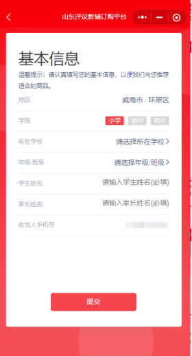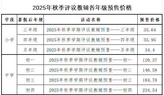 一、注册登录 微信识别右侧 “评议教辅” 小程序二维码,已有账号无需重复注册,新用户完成注册流程 。  二、信息完善1. 注册完成后,进入主页面点击右下角【会员中心】,进入学籍注册页面。 2. 点击 “基本信息” 后点右上角 “添加基本信息”(之前添加过学籍信息的点击查看确认学籍信息是否正确 )。 3. 选择城市→【威海市】,选择地区→【学校所在区】,学段→【对应小学、初中】,然后准确选择学校、年级、班级,正确填写学生及家长姓名、手机号,点击提交完成学籍注册。 4. 若需给多位学生交费,可继续点击右上角 “添加基本信息” 增加学籍信息 。  三、教辅预售缴费1. 点击预售,进入 “2025 秋季学期评议教辅预售活动”,点击→【去下单】,即可查看本学生暑假后所在年级“预售活动”。 2. 进入页面后,即可查看所在年级用书情况(学生所在年级用书已默认选择),年级预售价格请参考下方“2025年秋季评议教辅各年级预售价格”,避免年级用书订购有误,导致开学后学生无法正常用书。