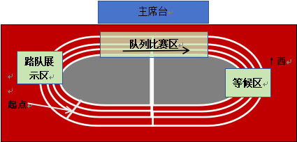1.比赛从五年级部开始进行,以级部为单位带出,比赛时各班自东南角起跑线出发,由南向北行进,自北边下场到各班观看区观看比赛。 2.每个班级提前一个班级候场,并注意保持安静。 四、比赛内容: (一)一至二年级 1.整理队伍——齐步走入场(班级口号)——原地踏步——立定——向左转——稍息——立正——向前看齐——向前看——报数——稍息(面向主席台)。 2.报数:体育委员跑向主席台报告人数,内容如下:“报告老师,xx班应到xx人,实到xx人,报告完毕请指示。(主席台回复比赛开始)” 3.立正——停止间转法(向右转、向左转各两次)——向右转——齐步走出场——队伍按指定路线回到原指定位置。 (二)三至四年级 1.整理队伍——齐步走入场(班级口号)——原地踏步——立定——向左转——稍息——立正——向右看齐——向前看——报数——稍息(面向主席台)。 2.报数:体育委员跑向主席台报告人数,内容如下:“报告老师,xx班应到xx人,实到xx人,报告完毕请指示。(主席台回复比赛开始)” 3.立正——停止间转法(向右转、向左转、三四年级加向后转各两次)向左转——齐步走——立定(半场)——向后转——稍息——立正——向前看齐——向前看——齐步走出场——队伍按指定路线回到原指定位置。 (三)五年级 1.整理队伍——跑步走入场(班级口号)——立定——向左转——稍息——立正——向右看齐——向前看——报数——稍息(面向主席台)。 2.报数:体育委员跑向主席台报告人数,内容如下:“报告老师,xx班应到xx人,实到xx人,报告完毕请指示。(主席台回复比赛开始)” 立正——停止间转法(向右转、向左转、五年级加向后转各两次)向左转——齐步走——立定(半场)——向后转——稍息——立正——向前看齐——向前看——跑步走出场——队伍按指定路线回到原指定位置。 五、比赛要求: 1.以班为单位参加比赛,全体学生参与。 2.队列整齐、动作规范、服装整齐一致。 3.各班派一名学生负责带队、整队及喊口令。 4.各班班主任指挥学生在预备线前排好队,听从指挥出队比赛,并抓好学生场下纪律。 5.各班出入场时排四路纵队,由矮至高排列并看齐,学生间前后保持一臂距离。 6.入场、退场齐步走。 7.行进间:要求学生挺胸收腹,眼睛平视前方,精神饱满。 8.各班级比赛结束后沿跑道绕行至操场北侧足球门处,沿横线自东向西变二路纵队站好。 六、评分标准: 1.班级队伍整齐,服装统一,口号响亮干脆。(2分) 2.队形变换迅速、齐整,没有失误。(5分) (1)方位转动时有错误,(学生出错,酌情扣分) (2)变换队列速度慢、(学生出错,酌情扣分) (3)队列队形时溜号、速度慢、注意力不集中(学生出错,酌情扣分) 3.体委声音洪亮,口令清晰、准确,应变能力强。(1分) 4.学生团结协作,精神风貌好,有较强的集体荣誉感。(1分) 5.班级人数要全勤(1分)。 八、计分及奖励办法: 1.分项计分,各项平均分之和为最终得分。 2.按年级设一、二等奖。(注:四个班级的年级设2个一等、2个二等,三个班的年级设1个一等、2个二等,两个班的年级设1个一等、1个二等。) 3.全校范围内评出8名优秀体育委员。 九、评委及工作人员安排: 1.评委:王丽、刘一鸣、朱广秀、邵一心、徐美玲、梁艳芳 2.摄影:刘琰、高衍玉、于兴云 3.统计分数:黄慧娟、卢冕 4.比赛场地组织协调、场地准备:陈春阳、牛余威、徐彩云 5.领奖引导:高衍玉、于兴云 6.音乐播放:孙文茜 7.公众号:报名 未尽事宜另行通知。