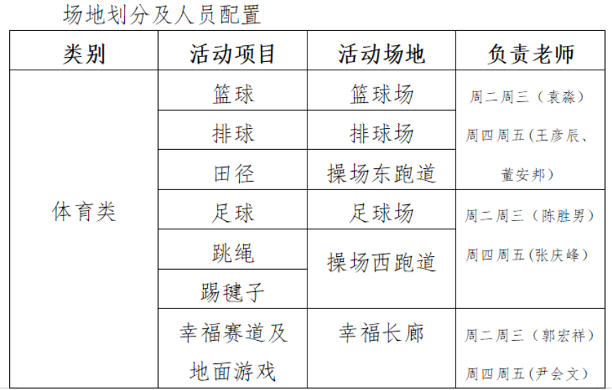 为更好地落实“双减”任务,坚持健康第一的育人理念,深入实施小学生体质强健计划,提升学生课间活动质量和身心健康发展水平,我校将积极探索学校课间活动改革,将课间10分钟延长至15分钟,以完善的全链条监管机制、坚强的保障体系、多元的活动形式开发“15分钟趣味课间”,确保每个学生每天“综合体育活动2小时”,科学安排我校作息时间和课程表,让每个学生都能在课间和体育活动中感受到学校教育的快乐和体育运动的美好。 一、总体目标 课间活动是学生调节学习节奏、促进身心健康的重要环节。新都小学坚持以“五育融合”为导向,以“增强学生核心素养”为目标,以安全性、趣味性、主动性、成长性为活动原则,打造“5+N+2”创玩课间项目和“4+1及3+2”模式确保每天2小时综合体育活动,让学生在童玩童趣中,增强体质,全面健康成长。 二、主要措施 (一)高质量实施“课间 15 分钟”行动 5大措施保证有序开展 1.优化课时配置,保证活动时间 在切实保障国家课程教学所需时长的基础上,学校调整一日作息时间,保证15分钟小课间时长,其次,对早晨、 中午、活动课等长时间段进行精细划分,保证学生的活动时间。“微调”实则“大动”。看似只是微调活动时间,其实要对改变课间管理制度、转变教师对于课间活动的观念认知等根基方面增强课间活动的主体意识。不仅保证了学生课间休息和活动时间,更为高效课堂的打造赋能增效。 2.探索实施长短课时改革,夯实高效课堂 打破40分钟的传统课时安排,基于学生、学科特点,对课程时长进行灵活科学的调配,调配出50分钟大课时(1节/日)安排作文、书法、科学等学科 活动完整经历学习过程,探索实施各学科探究式、项目化学习和跨学科学习;40分钟中课时(2节/日)和35分钟短课(2节/日)安排数学、英语等学科精学 精练;打造20分钟微课(1节/日),借力威海名师辅导讲堂开展诵读、习字、学后反思等学习活动。 3.课间活动空间优化利用,保证活动空间 为了给学生提供更为丰富多样的课间活动场所,我们将对校内空间进行全面的优化利用。室内空间方面,充分利用了教学楼内的各个角落,创建福爱阅读空间和实践体验空间等多元化活动区域,同时在班级中成立游戏角,摆放课间游戏道具,并且张贴游戏规则,让课间活动有趣又有序。室外空间方面,我们将合理规划操场、走廊、耕福园劳动实践基地等区域,设置了各种运动器材和游戏设施,满足学生不同运动需求和游戏喜好。通过这种环境的设置以及开放促进课间活动更好地开展,从而激发学生的好奇、创新精神和团队意识。 室外全场域活动空间:除室外的篮球、足球、排球活动区域外,我校将结合学校传统文化特色,巧妙利用室外地面绘制6款漂亮的“格子活动区”以及耕福园劳动实践基地,格子活动区分别为跳房子区、绳舞飞扬区、百变大脚丫区、强身“毽”体区、简爱园棋盘区和投掷区。为保证学生的参与热情,学校还针对每款“格子区”设计多种通关方式,例如百变大脚丫区设置了三种通关方式供学生挑战,大大增加了学生游戏的积极性。同时,学校还鼓励学生自主探究多元通关方式,让不变的格子区焕发出多样的童年乐趣。 室内全场域活动空间:每个班级开设专属活动区域—运动角匠心独运,它恰似精巧玲珑的运动乐园,各类体育与益智器具交错纵横,呈献多元课间之选。班级特色运动角由师生购买一些收纳器材彩绘布置,不仅可以用于存储各班级的运动类器材如跳绳、篮球、足球等器材及益智类器材如数字华容道、数独、拼图、积木、魔方、魔尺、九连环等多项益智类游戏,让班级运动角兼具实用与美观之韵成为班级文化的一大特色。 走廊全场域活动空间:每个年级的走廊打造了福爱“5吧”分别为福爱阅读吧、科技玩玩吧、思维做做吧、聊聊吧、秀秀吧,主要用于开展休闲阅读、魔方科技挑战、五子棋大挑战、同学畅聊、秀秀我的拉伸力等多种活动。让孩子们释放出个性活力,让课间回归其本真的意义,打造充满活力与乐趣的课间活动新生态。 4.丰富学生课间活动内容,提升交际能力 学校依据“五育融合”理念,开发出丰富多彩的课间活动内容上,涵盖德育、智育、体育、美育、劳育各方面,注重培养学生团队协作与沟通能力。组织形式上,鼓励小组合作与团队竞赛,设置特色空间与团辅活动,提供开放性活动空间和材料支持,让学生自主选择、设计玩法,使课间活动更加多样与精彩。 5.创新活动形式,夯实综合素养 我校遵循“整体要求和兴趣吸引、校备器械和个人自带、校设项目和学生自创”结合原则,统筹构建了大课间“练兵式”集中、小课间“自助餐式”分组分项、“自主多选式”自由活动模式,分年级细化落实,让每个学生都找到适合自己的活动方式,实现动起来、悦起来。 “N”种活动丰富小课间 为强化学生体能,让学生在课间活动中收获快乐,享受成长。学校形成涵盖以下“益智、悦劳、健体”三大课间特色,引领课间新风尚。 1.益智——玩转智趣游戏 为了丰富学生的小课间活动,学校将教学楼前的石铺路面、楼内走廊进行设计打造,将包含健体、益智、趣味的传统地面游戏“ 画 ”进了校园,“引”进了教学楼层。 2.悦劳——融合校本课程 基于我校的校本课程——葫芦文化课程,将室外耕福园、葫芦种植园、班级培绿园作为课间活动养护基