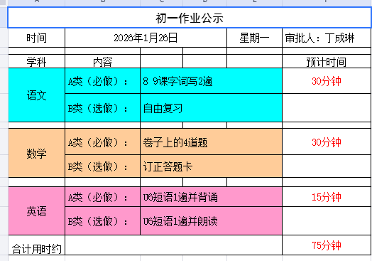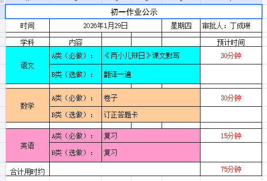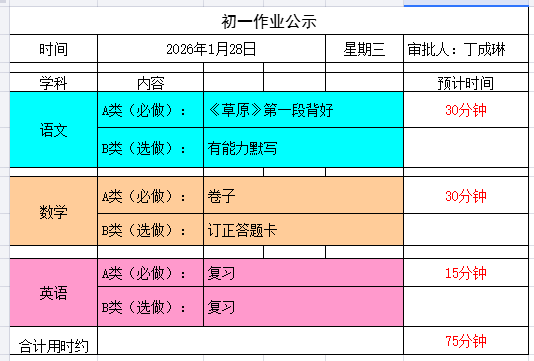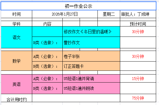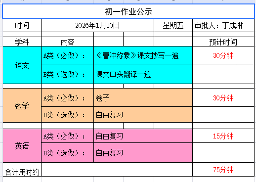 崮山中学初一作业公示(1月26日-1月30日)